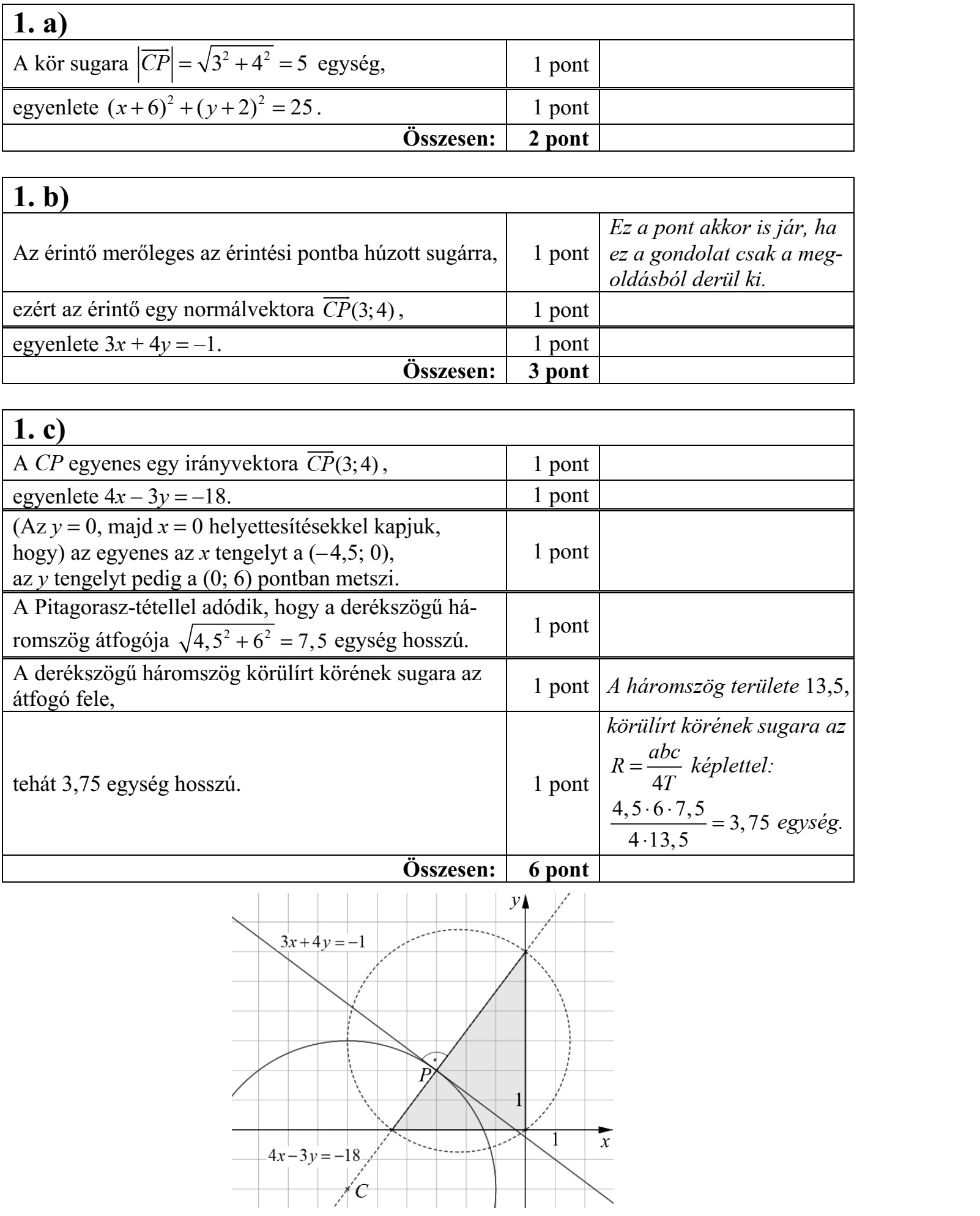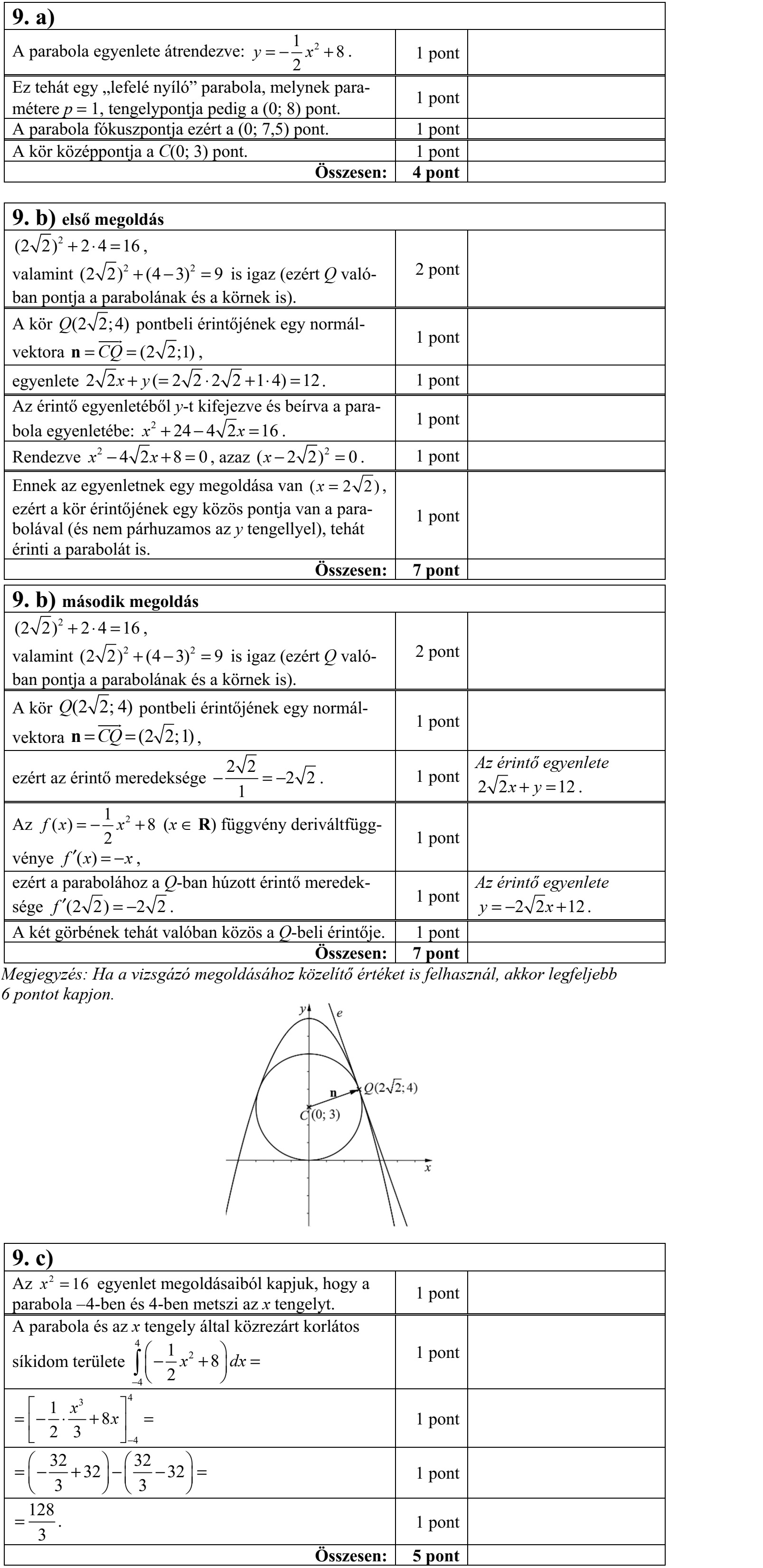 ![Egy nyolcfős csapat kosárlabdaedzése közben mind a nyolcan 10-szer kíséreltek meg há- rompontost dobni. A sikeres dobások számát mind a nyolc főnél felírták. A feljegyzett számok: 6, 3, 7, 6, 4, 7, 8 és 7. a) Határozza meg a sikeres dobások számának átlagát, mediánját és szórását! A kosárlabda büntetődobást 4,6 méter távolságról kell elvégezni, a gyűrű 3 méter maga- san van. Petra a dobás pillanatában 2 méter magasságból engedi el a labdát, és az ideális, vízszintessel bezárt 45°-os szögre törekszik a dobás indításánál. b) Petra dobásának modellezéséhez határozza meg annak a parabolának az egyenletét, amely áthalad a P(0 2) és a Q(4,6 3) ponton, a P pontban húzott érintőjének irány- szöge pedig 45°! A parabola egyenletét y = ax2 + bx + c alakban adja meg! Az ábrán a [-2 3] intervallumon értelmezett szigorúan monoton, folytonos f függvény grafikonja látható. c) Adja meg az f inverzfüggvényének értelmezési tar- tományát, értékkészletét, zérushelyét, és jellemezze az inverzfüggvényt monotonitás szempontjából!](https://vantus.hu/kep/erettsegi_emelt/2021_1/vantus_hu_erettsegi_emelt_2021_1_7.jpg)