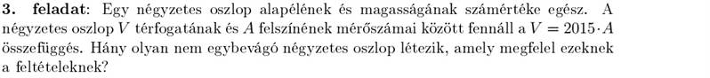 Egy fából készült négyzetes oszlop minden élének hossza centiméterben mérve 2-nél nagyobb egész szám. A négyzetes oszlop minden lapját befestettük pirosra, majd a lapokkal párhuzamosan 1 cm élű kis kockára vágtuk. A kis kockák közül 28 lett olyan, amelynek pontosan két lapja piros. Mekkora lehetett a négyzetes oszlop térfogata?