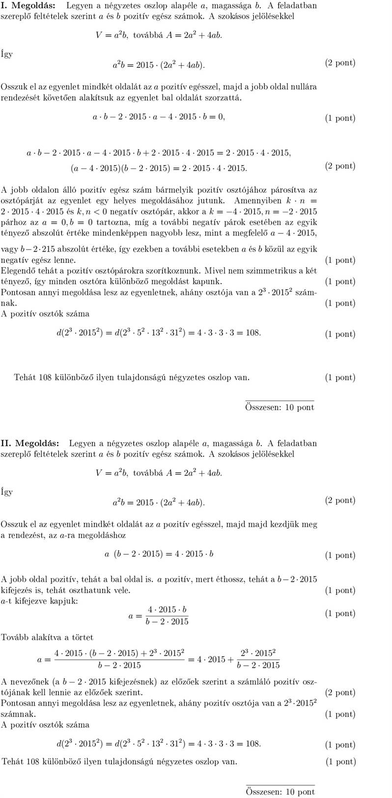 Két egyenes hasábot építünk: H1 -et és H2-t. Az építéshez használt négyzetes oszlopok (négyzet alapú egyenes hasábok) egybevágók, magasságuk kétszer akkora, mint az alapélük. A H1 hasáb építésekor a szomszédos négyzetes oszlopokat az oldallapjukkal illesztjük össze, a H2 hasáb építésekor pedig a négyzet alakú alaplapjukkal - az ábra szerint. a) A H1 és H2 egyenes hasábok felszínének hányadosa: 8,0 2 1 = H H A A . Hány négyzetes oszlopot használtunk az egyes hasábok építéséhez, ha H1 -et és H2 -t ugyanannyi négyzetes oszlopból építettük fel? b) Igazolja, hogy a + + 14 23 n n (nN+ ) sorozat szigorúan monoton csökkenő és korlátos!
