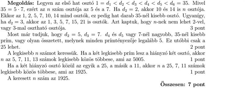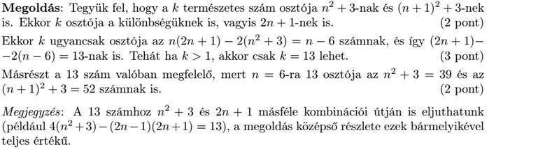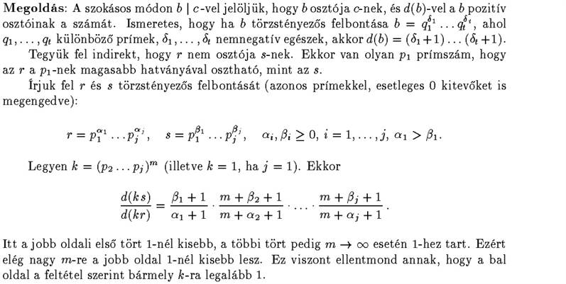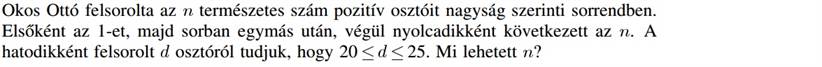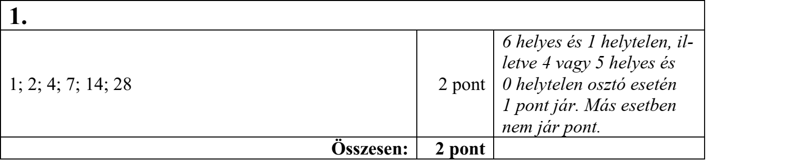 a) Ha a|b igaz, akkor a|b2 is teljesül (a és b pozitív egész számok). Fogalmazza meg a fenti (igaz) állítás megfordítását, és állapítsa meg a megfordítás logikai értékét is! Válaszát indokolja! (a|b azt jelenti, hogy az a egész szám osztója a b egész számnak.) b) Hány olyan n pozitív egész szám van, amelyhez létezik olyan p (pozitív) prímszám, amelyre az pnn 2 különbség is egy (pozitív) prímszámmal egyenlő? Egy lapra 10 pontot rajzoltunk, majd ezeket megszámoztuk 1-től 10-ig. Ezután minden egyes pontot egy-egy vonallal összekötünk a lapon szereplő összes olyan ponttal, amelyhez írt szám a kiválasztott ponthoz írt számnak osztója. (Például azt a pontot, amelyhez a 6-ot írtuk, összekötöttük mind a négy ponttal, amelyhez a 6 valamelyik osz- tóját írtuk.) c) Igazolja, hogy az így kapott 10 csúcsú gráf nem egyszerű gráf! d) Igazolja, hogy a gráf éleinek száma páratlan!