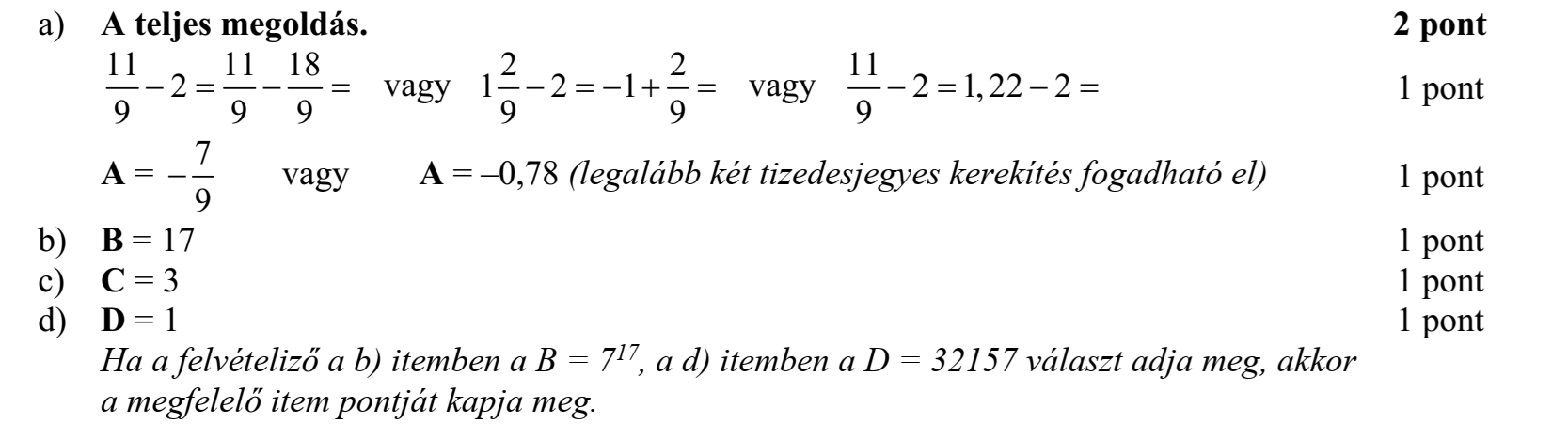 Határozd meg az A, B, C és D értékét! 11 a) A = -2/9 Írd le a számolás menetét is! A = …………………. b) 79·78 = 7B B = …………………. c) C = a 2; 3; 3; 4; 5; 2; 3; 3; 2; 4; 1 számsokaság módusza C = …………………. d) D egy számjegy, amivel a 32D57 ötjegyű szám osztható 9-cel. D = ………………….