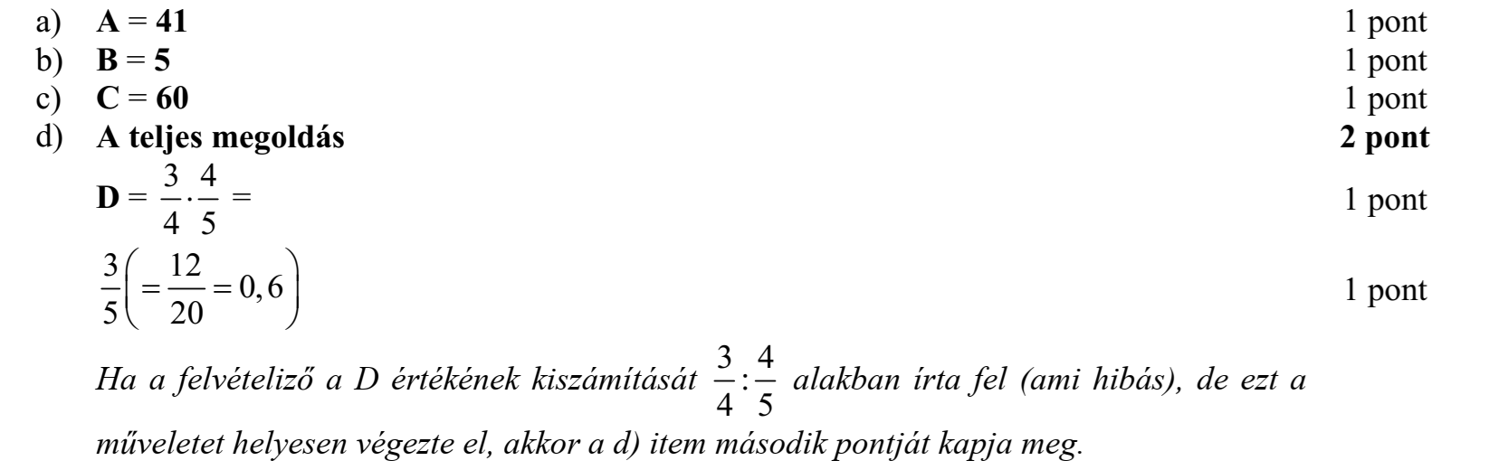 Határozd meg az A, B, C és D értékét! A a) 10, 25/4 A = ............................. b) B az 1; 2; 4; 8; 10 számok átlaga B = ............................. c) C az a legkisebb pozitív egész szám, amelynek 1; 2; 4; 5 és 6 is osztója. C = ............................. 3/4 d) D a -nek a része 4/5 Írd le a számolás menetét is! D = .............................