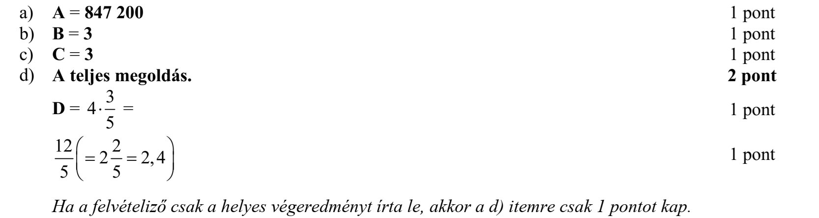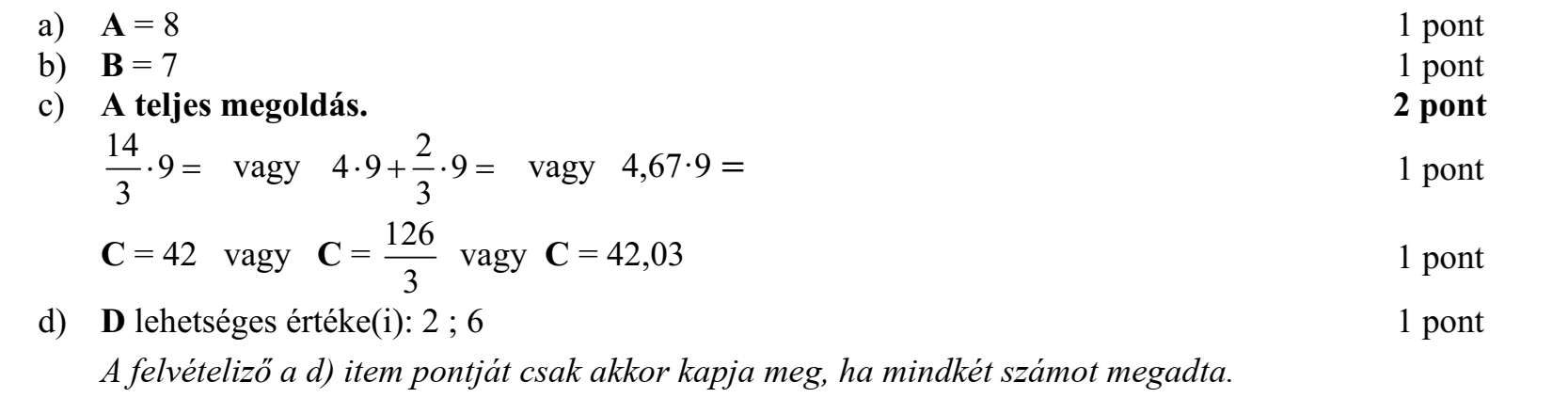 Határozd meg az A, B, C és D értékét! a) A = 42,36ꞏ20 000 A = …………………. b) A B egy olyan számjegy, amelyet behelyettesítve a 43B17 ötjegyű számba, ez az ötjegyű szám osztható 9-cel. B = …………………. c) Az 1; 3; 6; 1; 3; 5; C; 7; 9 számsokaság egyetlen módusza 3. C = …………………. d) 5 3 D = 4 Írd le a számolás menetét is! D = ………………….
