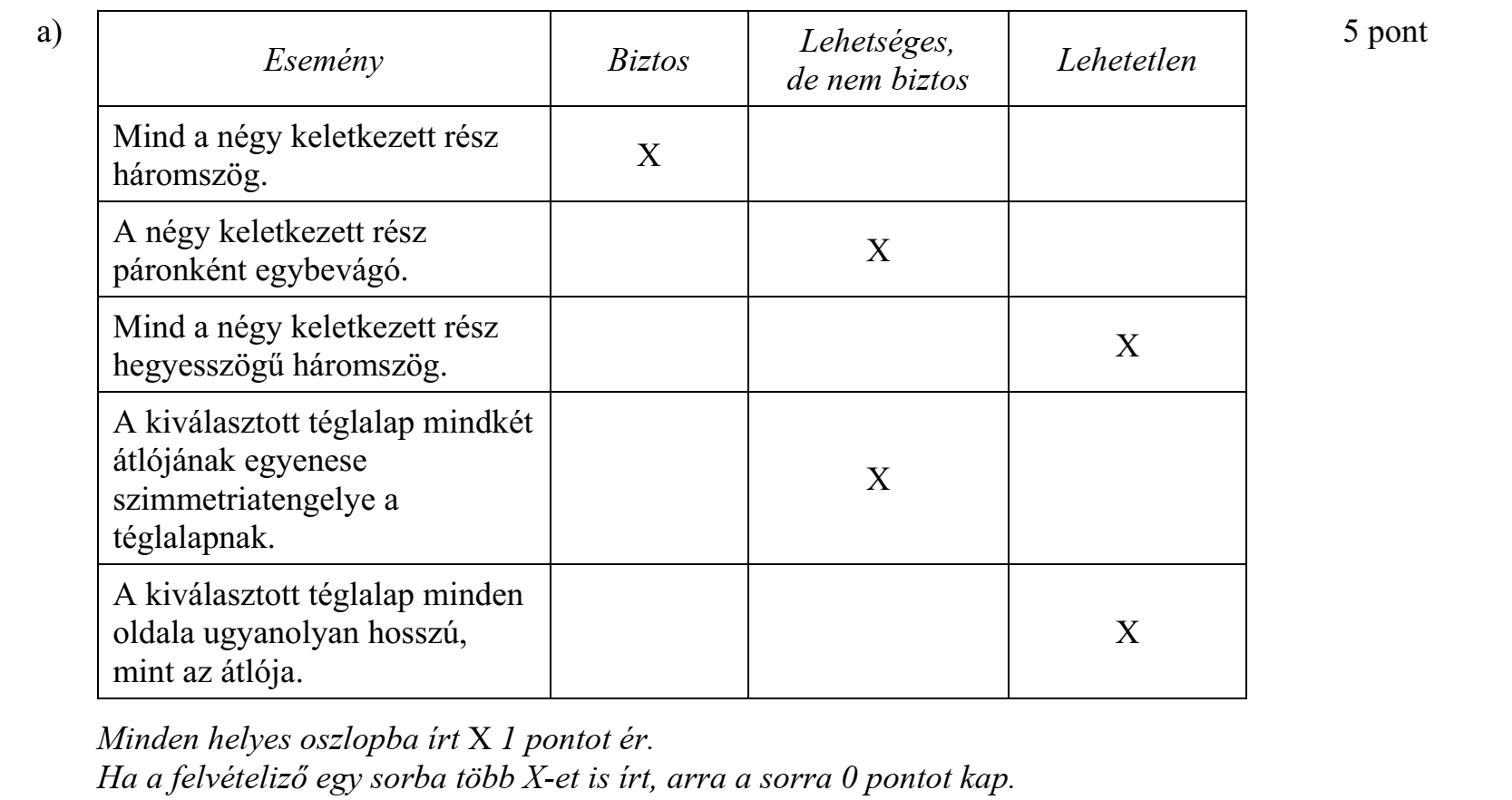 Papír síkidomok egy készletéből találomra kiválasztottunk egy téglalapot, majd a két átlójának egyenesével négy részre osztottuk. Az alábbi eseményekről döntsd el, hogy biztos vagy lehetséges, de nem biztos vagy lehetetlen ! Írj -et a táblázat megfelelő oszlopába! Lehetséges, Esemény Biztos Lehetetlen de nem biztos Mind a négy keletkezett rész háromszög. A négy keletkezett rész páronként egybevágó. Mind a négy keletkezett rész hegyesszögű háromszög. A kiválasztott téglalap mindkét átlójának egyenese szimmetriatengelye a téglalapnak. A kiválasztott téglalap minden oldala ugyanolyan hosszú, mint az átlója.