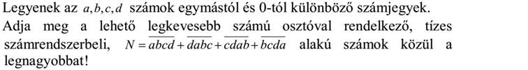Keressünk a következő tulajdonságok mindegyikével rendelkező négyjegyű, pozitív egész számokat: - az ezresek és a tízesek helyi értékén páratlan számjegy legyen, a százasok és az egyesek helyi értékén páros számjegy legyen, - ne legyen benne két egyforma számjegy, - a számjegyek csökkenő sorozatot alkossanak, - a négyjegyű szám hárommal osztható legyen! A feltételeknek megfelelő négyjegyű szám például a 9210. a) Adj meg öt további, a feltételeknek megfelelő négyjegyű számot! Megoldásaidat a vastag vonallal körülvett részbe kell beleírnod, mert csak ezt értékeljük. A példaként megadott számot már beírtuk. A bekeretezett rész alatti területen próbálkozhatsz, de az oda beírt számokat NEM értékeljük! Vigyázz! Ha a megoldásaid közé hibás számot is beírsz, pontot vonunk le. Megoldásaim: 9/2 1/0